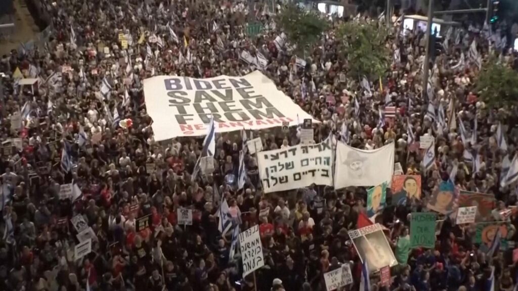 Tens of thousands of protesters have rallied in Tel Aviv to call for the resignation of Benjamin Netanyahu and the immediate release of hostages.
