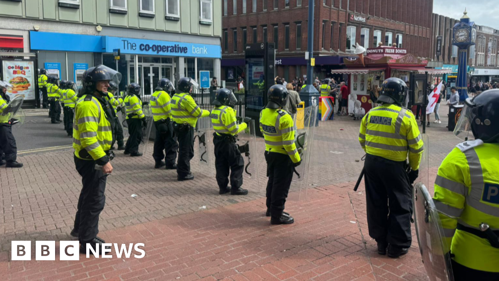 Footage shared online appeared to show an officer with a loud hailer addressing a group outside a mosque in Stoke-on-Trent.