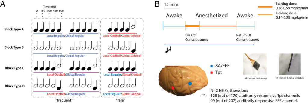 Meanwhile, when a global oddball was presented during wakefulness, the researchers could use software to “decode” representation of that among neurons in FEF and the prefrontal cortex (another cognition-oriented region). They could also decode local oddballs in the Tpt. But under anesthesia the decoder could no longer reliably detect representation of local or global oddballs in FEF or the prefrontal cortex.